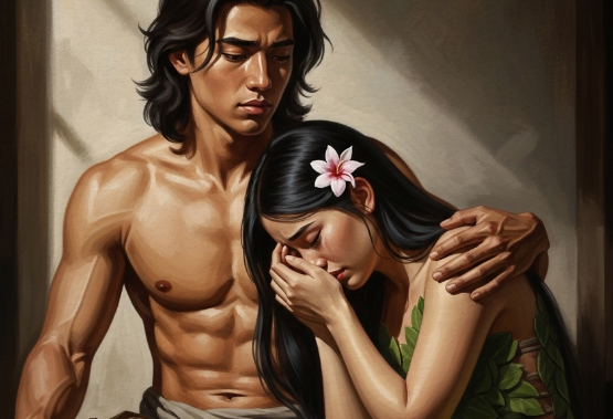 홀로 남아 울고 있는 하와를 아담이 발견했다. 무슨 일이 있었는지 알지 못했지만, 그는 그녀의 슬픔에 마음 아파하며 조용히 다가가 그녀의 어깨를 감싸 안았다.