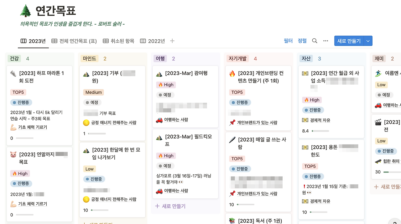 목표를 분류별로 나누고, 인생목표와 연계해 둠으로써 목표를 조금 더 체계적으로 관리해 볼 수 있습니다. 나에게 딱 맞는 노션 템플릿을 만들어 사용하면서, 내 생활에서 변화한 점도 함께 영상에 소개해하기도 했습니다. 얼굴과 이름을 공개하는 것이 조금은 부담스러워서 미모티콘을 활용했어요.