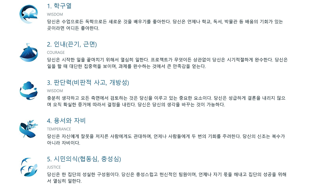 아래의 테스트는 무료로 진행할 수 있는 성격 강점 테스트입니다.