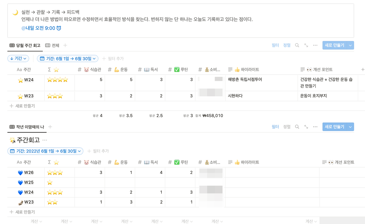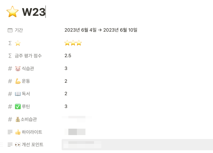 숫자로 보면 조금 더 명확해지므로 저는 한 주의 상황을 수치화하여 보고 있어요. 식습관부터 루틴까지 수치를 넣어두면 평균이 계산되고 이를 기반으로 별점이 자동으로 표시되죠 (I LOVE 자동화)