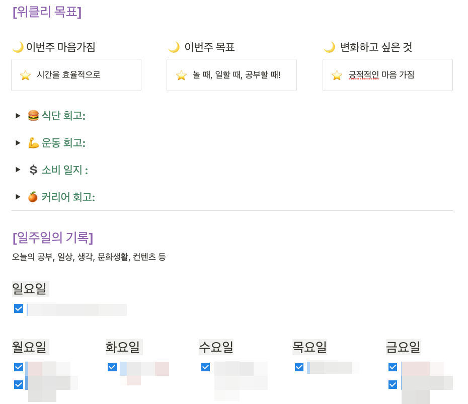 회고는 일별 기록이 포함되어 있어 일요일에 한 번에 진행하기보다는 매일 저녁 5분 정도 업데이트 하는 시간을 갖고 있습니다.