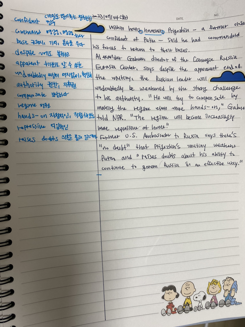 스터디의 장점은 무엇보다 다양한 신문사에서 영어 기사를 발췌하여 제공하기 때문에 여러 시선으로 시사점을 바라볼 수 있는 눈을 가지게 된다. 또한 선별된 표현을 소개해 줌으로써 영어 어휘력을 자연스럽게 쌓는데 도움을 준다. 적어두고 쓱 훑어보기만 했을 뿐인데 자꾸 눈에 익는 건 착각일까.