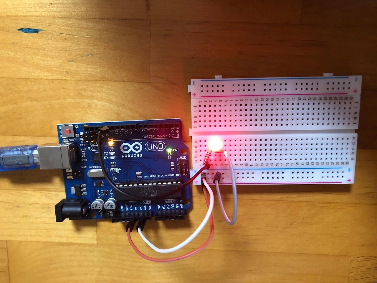 자 하단에 보면 딜레이 1000이라고 표시된 것이 1초이다. 1초간 불빛이 High(켜짐) 하고, 다시 1초간 불빛이 Low(꺼짐) 하다. 요 코드를 간단하게 상단의 체크 표시로 컴파일하고 화살표 표시로 전송하면 USB로 연결된 아두이노 우노가 해당 코드대로 작동하기 시작한다. 간단하다! 매우!