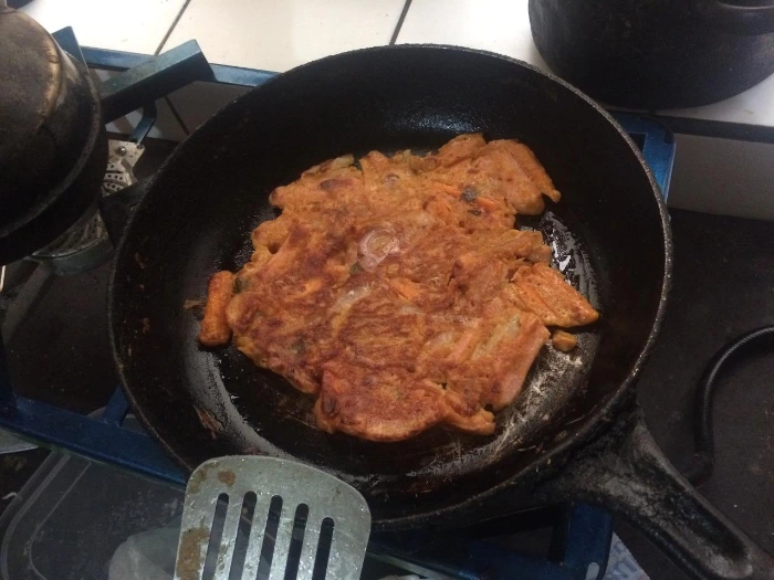 다행히 모두들 생각보다 맵지 않아했고, 또 정말 맛있어 했다. 전의 가장 큰 단점은 한 번에 많은 양을 요리하지 못하고, 팬에 한 장씩밖에 구워내지 못한다는 것 아닐까. 그렇다고 다 부치고 난 뒤에 한 번에 먹자면 식은 전은 그 맛이 처음만큼 못하니 부치는 대로 일단 먹으라고 잘라줬다. 접시는 자꾸 비워지고, 중간중간 빈 접시를 기다리는 상황이 생기기도 했다. 뭔가 절반의 성공 같은 기분…. 이건 그들의 식문화와도 어울리지 않는 것이겠지만 가장 맛있는 상태의 전을 맛보여주고 싶었을 뿐이다.
