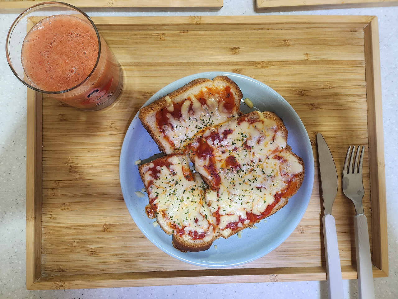 요리파가 승리한 날. 집에서 만든 토마토주스와 피자빵.