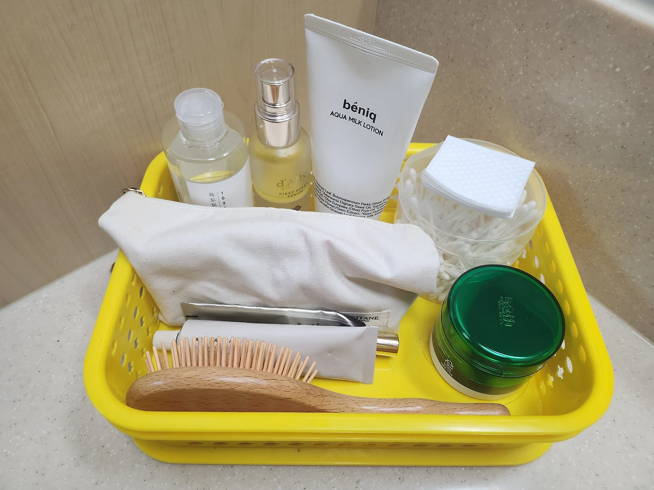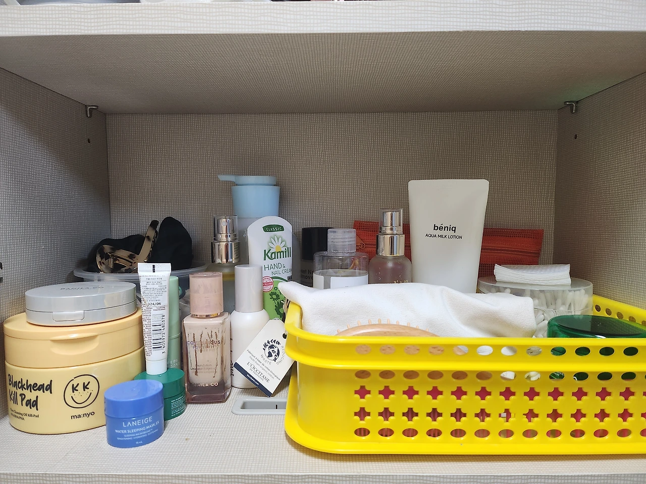 화장대 위에 있던 화장품들은 전부 수납장 안으로 넣어버렸다. 화장품이 나와있지 않으니 청소하기도 훨씬 수월하다. 매일 사용하는 기초제품과 머리빗은 아이가 학교에서 사용하던 노란 바구니를 사용해 한 곳에 모아두었고 작아서 분실되기 쉬운 아이브로우와 립밤류는 파우치에 넣어 바구에 담았다. 샤워를 하고 기초제품을 바를 때 바구니를 통째로 꺼내 바르고 다시 바구니 그대로 수납장에 넣는다. 먼지도 쌓이지 않고 깔끔하고 관리도 쉽다.