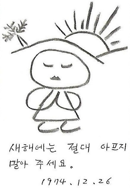 1974년 12월 26일, 권정생은 이오덕에게 편지 한 통을 보냅니다. 작은 엽서에 직접 그린 그림과 짧은 글을 쓴 연하장이였지요. 한 번만 봐도 선명하게 기억되는 편지의 그림은 이렇습니다. 종이 한 가운데 무릎을 꿇고 앉아 두 손을 모으고 기도하는 사람이 있고, 그 뒤에는 두 개의 산봉우리가 보입니다. 왼쪽에 있는 산에는 겨울나무 한 그루가, 오른쪽에 있는 산에는 새해를 밝히는 해가 걸려있지요. 그리고 두 손을 모으고 고요히, 간절하게 기도하는 사람 아래쪽에는 ‘새해에는 절대 아프지 말아주세요.’라는 짧은 글이 있습니다. 많은 말을 하지 않아도 깊은 마음이 느껴지는 편지였지요. 이오덕의 건강을 권정생이 얼마나 바라고 바랐는지 단 번에 알 수 있는 편지였습니다.