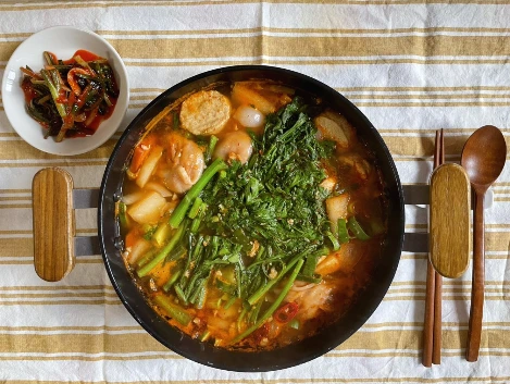 유정란, 두부, 쑥갓, 오디즙, 갓김치, 대파, 미나리