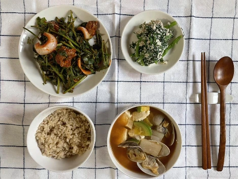 쑥갓은 나에게 탕에 넣어 먹는 부재료 그 이상의 의미였던 적이 없었는데, 엄청나게 싱싱한 쑥갓이 꽤 많이 왔다. 또 열심히 고민해서 두부 으깨고 들기름에 조물조물 무쳐내었는데, 아 생각보다 정말 맛있어서 놀랐다. 반찬이라고 부르기 아까울 정도의, 메인 디쉬라고 부르고 싶을 만큼 고소하고 향긋한 맛. 싱싱한 미나리는 역시 무침이 좋아서 오랜만에 새콤달콤하게 골뱅이 무침. 항상 단백질 식단은 한 개 이상 넣으려고 한다. 다른 것들도 다 그렇지만, 특히 미나리는 마트나 슈퍼에서 구입하는 것보다 월등히 신선하고 향이 좋은 물건이 와서 늘 뿌듯하다. 소규모 유기농 경작의 힘.