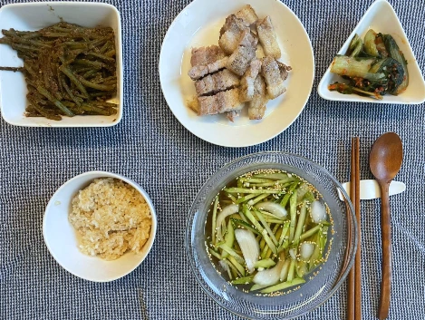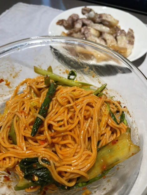 열무김치 하면 역시나 열무 국수. 요즘 들어 이렇게 김치를 빠짐없이 보내주고 있는데 너무 잘 먹고 있다. 약간 익지 않은 상태로 와서 조금 익혀먹으면 더 맛있음! 개운한 열무 국수는 역시 고기와 함께.