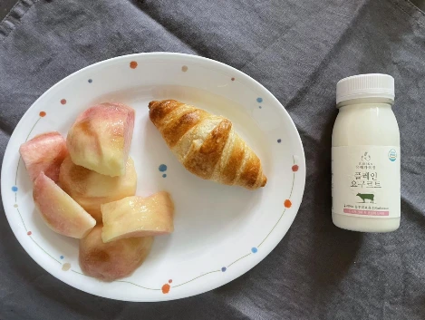 내 최애 여름과일(아니 사계절 과일 중에서도) 물복숭아와 함께 먹는 요구르트! 마시는 요구르트라기엔 꽤 꾸덕해서 과일과 섞어먹어도 되었을 듯. 요구르트도 역시 간편하고 맛있는 아침 요기거리.