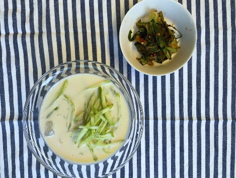 나의 온전한 여름 밥상, 콩국수와 열무김치! 이때만큼은 여름이 좋다 흑흑 ㅠㅠ 내 마음속 여름 계절 메뉴 1등 ㅠㅠ 콩국은 근처 시장에서 공수함. 콩국수는 그저 오이 잔뜩 때려 넣고 아삭아삭하게 먹는 게 좋다!