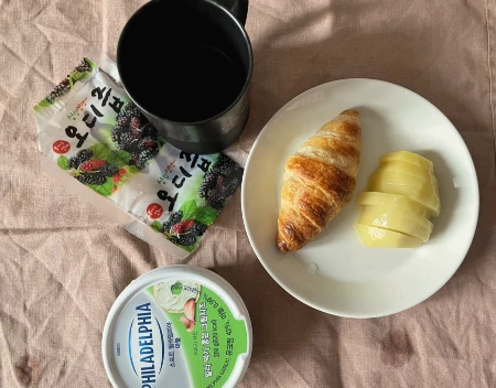 오디즙은 보통 3~4팩 정도 보내주시는데, 아침에 따뜻한 음식(주로 빵류)과 함께 먹는다. 크로와상 생지를 구워 크림치즈, 과일과 함께 냠냠. 오디즙 먹을 때마다 오디의 효능 알아보는데 늘 까먹곤 한다... 건강한 새콤달콤함.