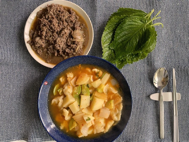 멸치 다시마 육수 600ml, 썰어놓은 김치와 김치 국물 1/3컵, 작은 감자 1개 (혹은 큰 감자 1/2개), 양파 1/4개, 애호박 1/6개, 대파 약간, 새우젓, 다진 마늘 1/2 큰술