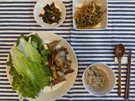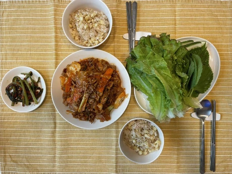 삼겹살과 함께 상추의 좋은 짝꿍 제육볶음. 옥수수 밥과 함께 든든한 한 끼. 제육볶음은 백쌤 레시피를 참고했다. 집밥, 한식 레시피로는 가장 맘 편하고 보장된 게 백쌤 레시피다 흐흐.