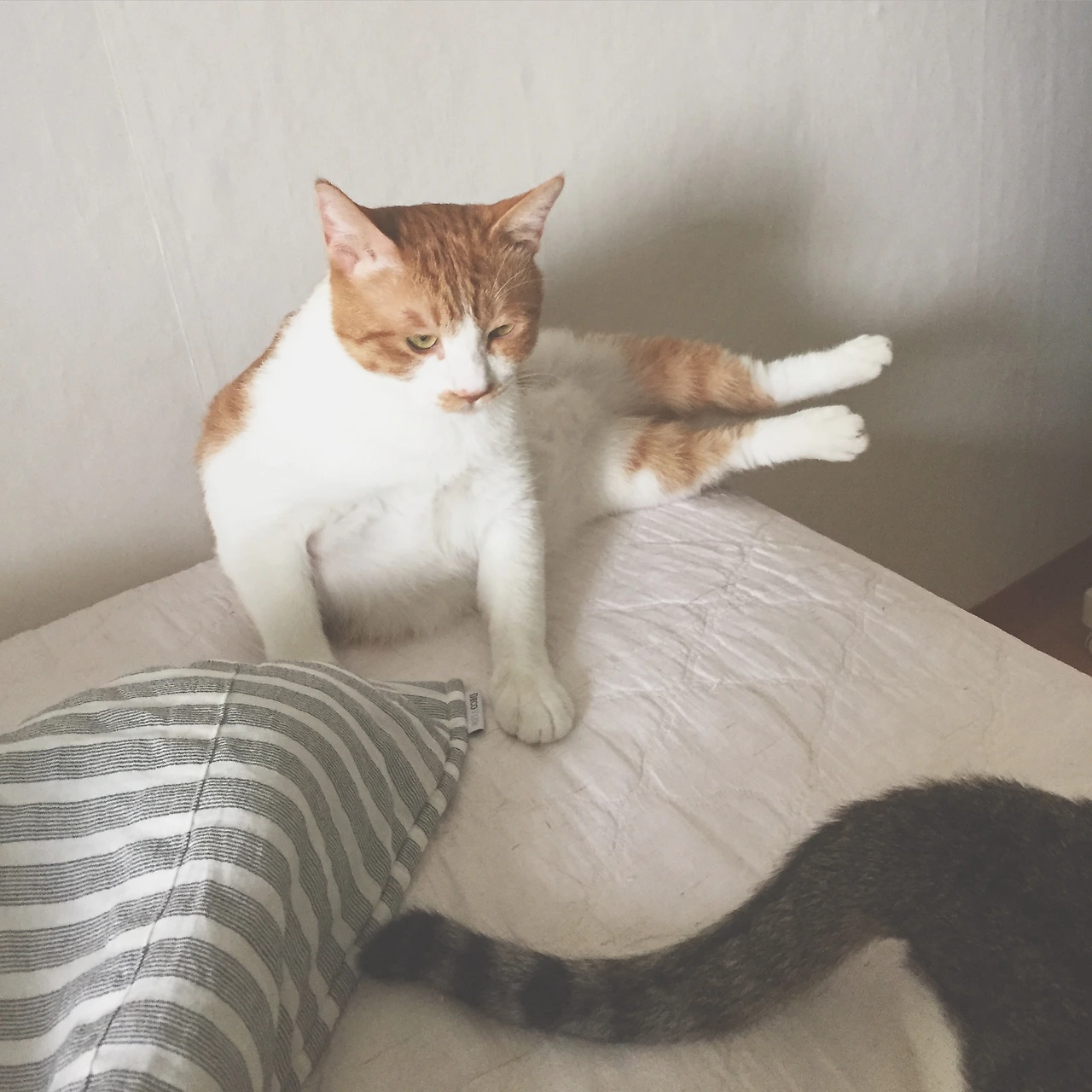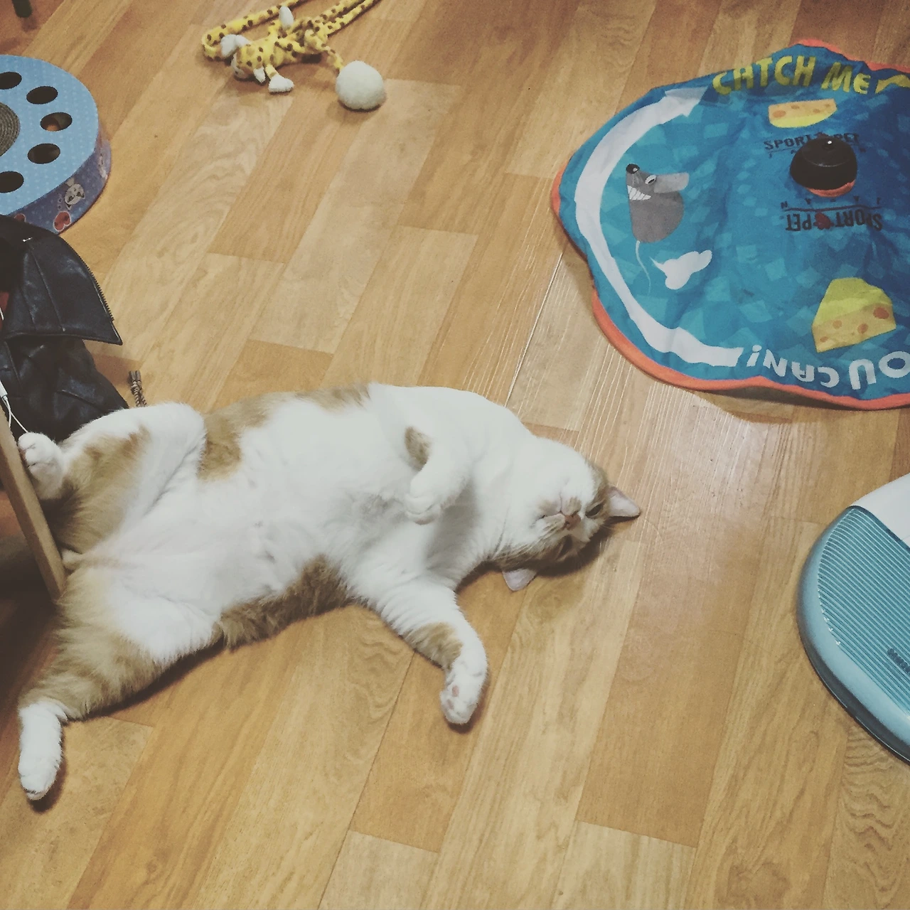 테이블 다리에 발 한짝 걸쳐 기대고, 배도 까뒤집고 저렇게.