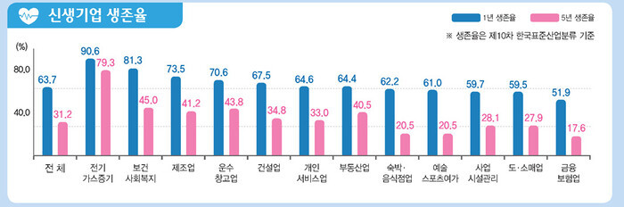 특히, 숙박/음식점업을 보시면 5년간 생존율이 20.5%로 10곳 중 8 곳이 폐업합니다. 음식점을 창업하면 5년 뒤에도 계속 장사를 하는 가게가 10 곳 가운데 2 곳, 그러니까 대부분 망한다는 데이터 분석 결과입니다.