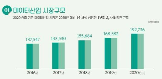 2020년 데이터 산업 전체 시장규모는 19조 원 규모로 2019년 대비 14.3% 성장하였습니다.