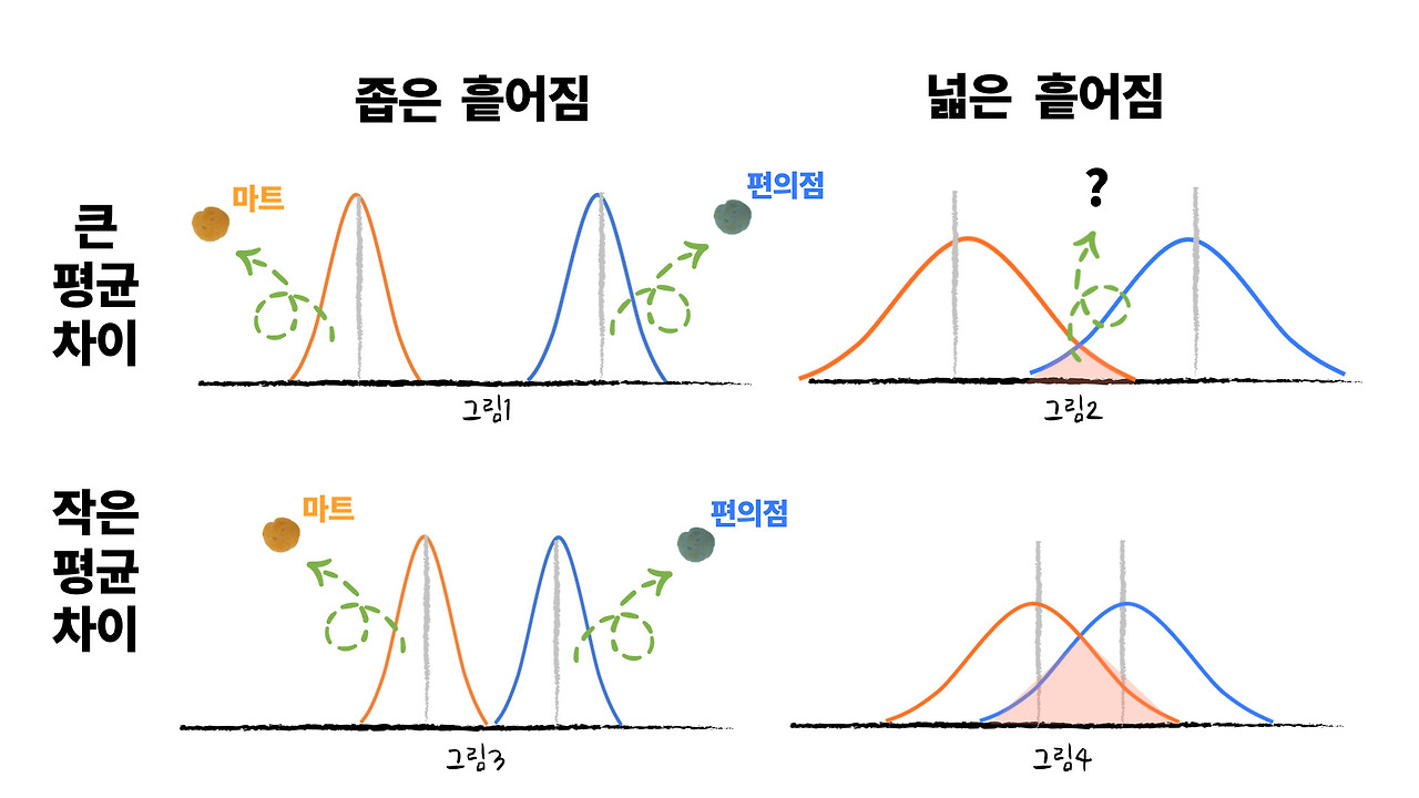 그럼 평균 차이가 클 때와 작을 때(2가지), 그리고 흩어진 정도가 넓을 때와 좁을 때(2가지) 각각 두 가지 경우의 수가 있다면 2가지 x 2가지는 아래와 같이 4가지 경우를 생각해 보기로 합니다.
