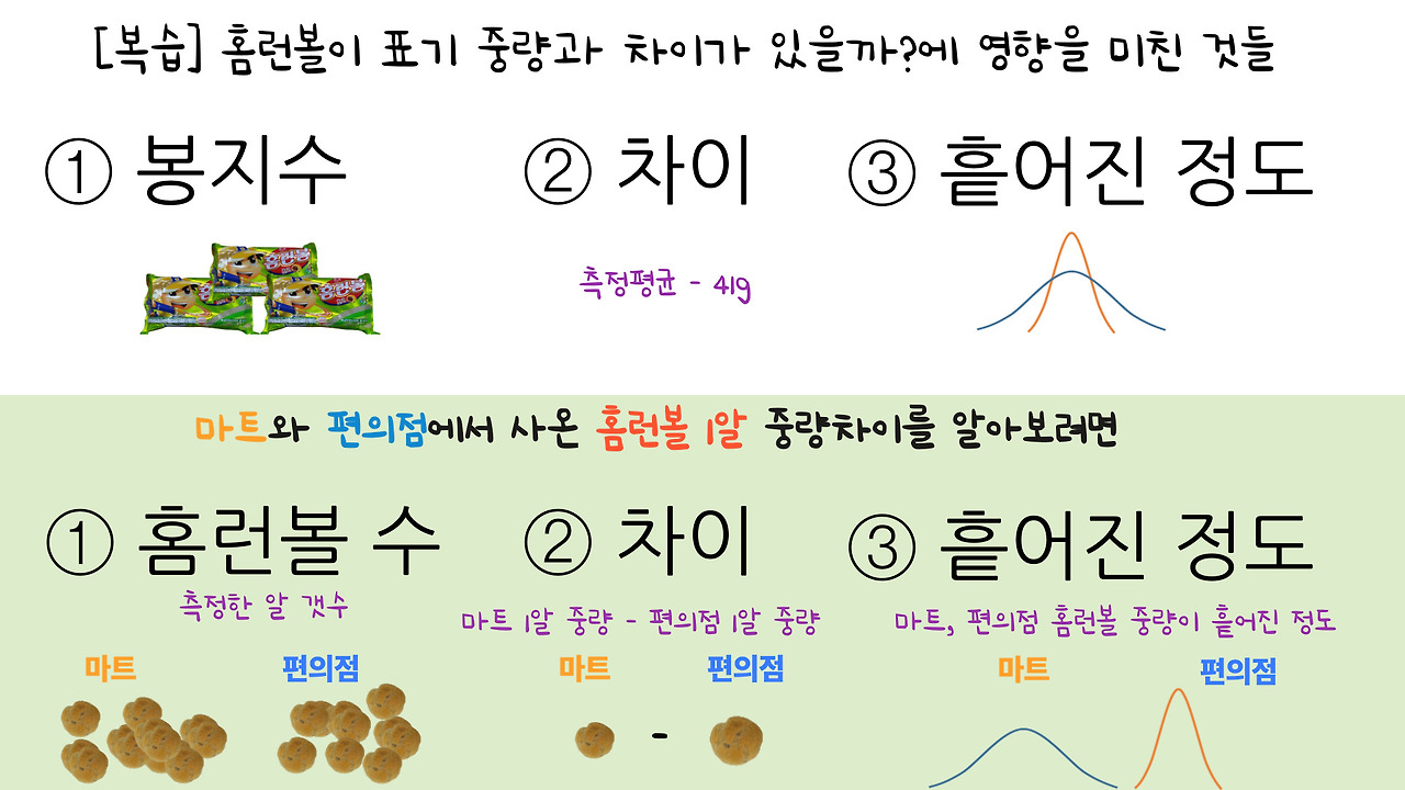 우연한 1 봉지를 측정해 보고 홈런볼 1알의 평균중량의 차이가 난다고 해서 무조건 "마트 1알 <편의점 1알"로 일반화할 수 있을까요?
