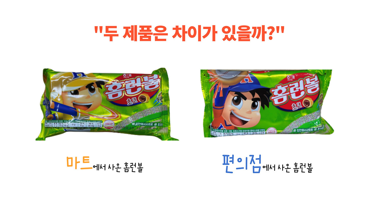 여기 마트 홈런볼과 편의점 홈런볼 두 제품이 있습니다.