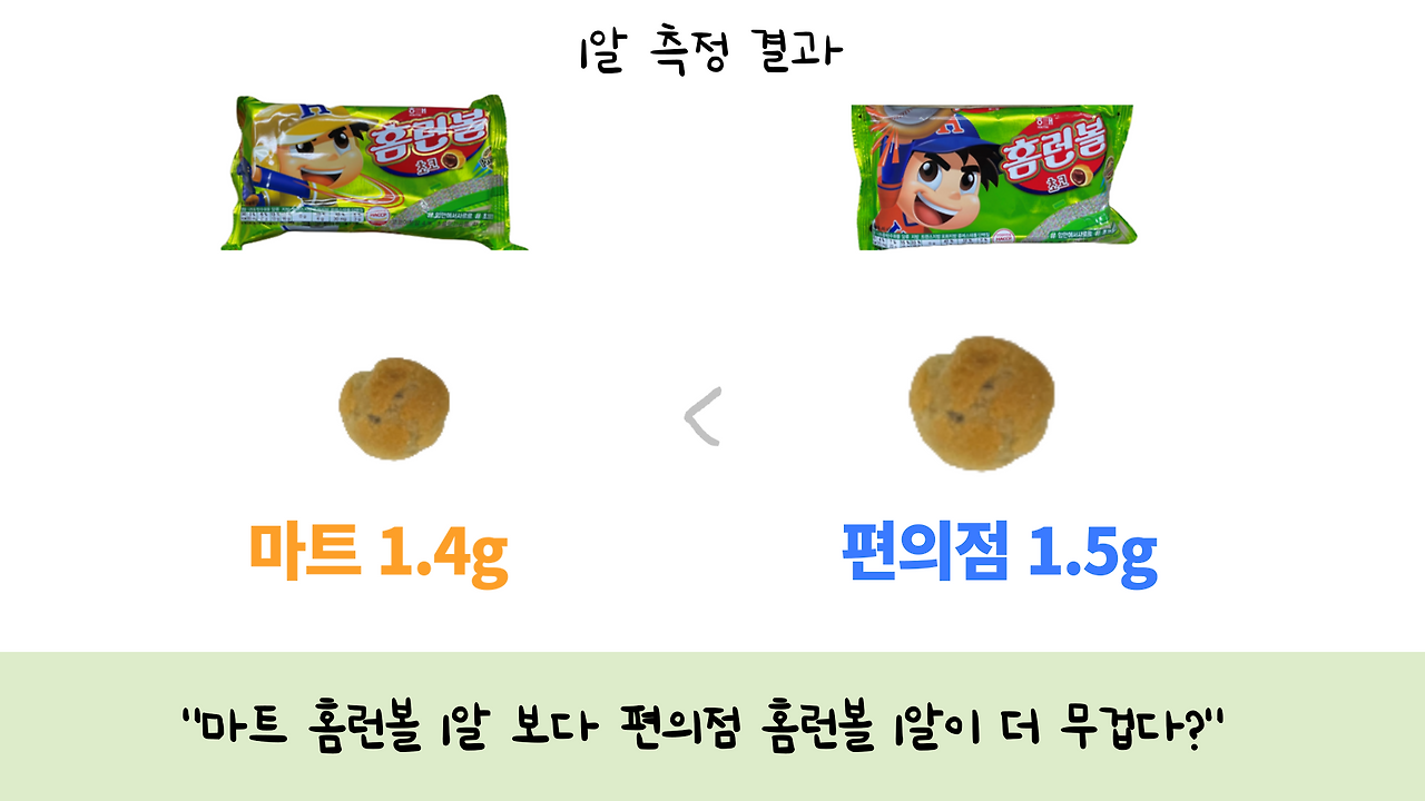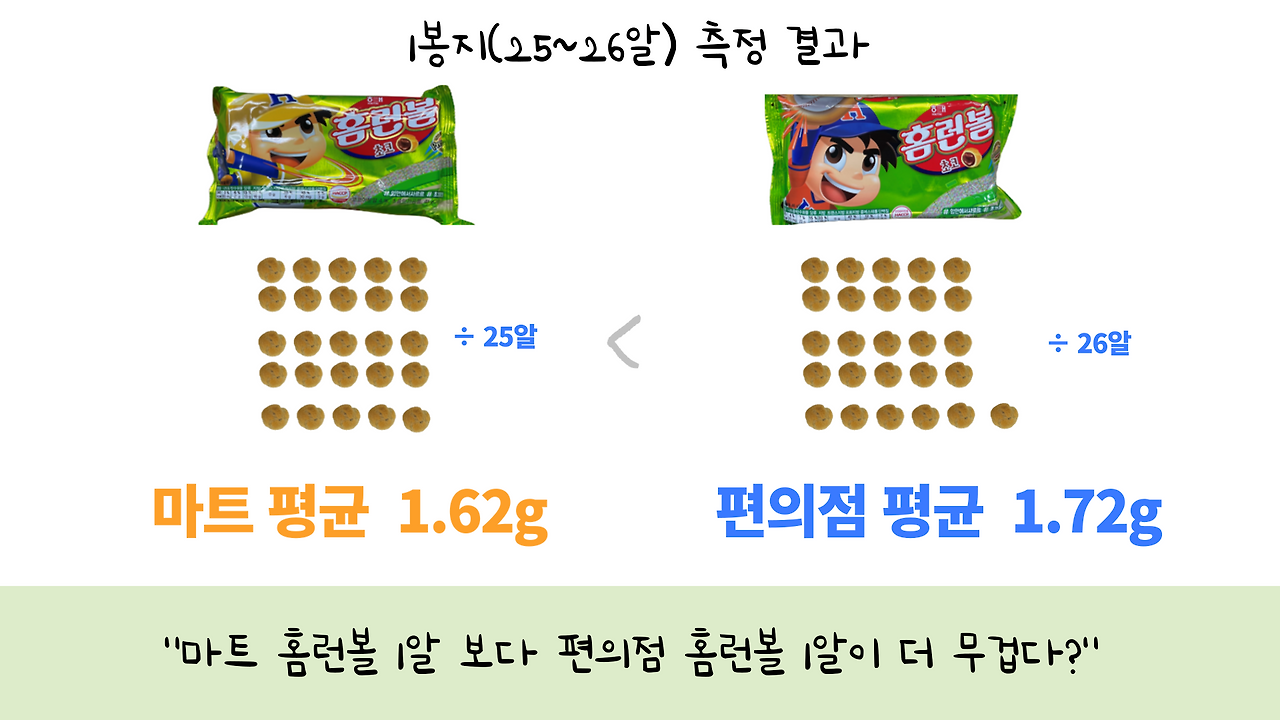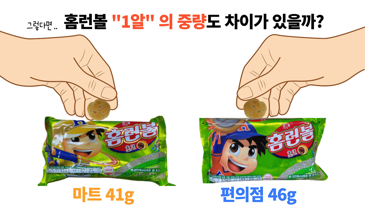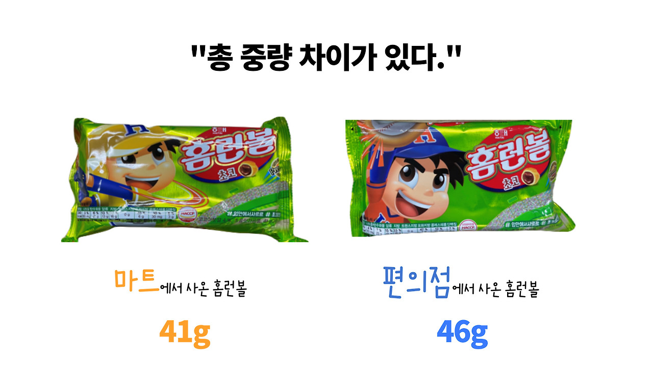 그렇다면 마트 홈런볼 보다 편의점 홈런볼이 더 무겁다 말할 수 있을까요?
