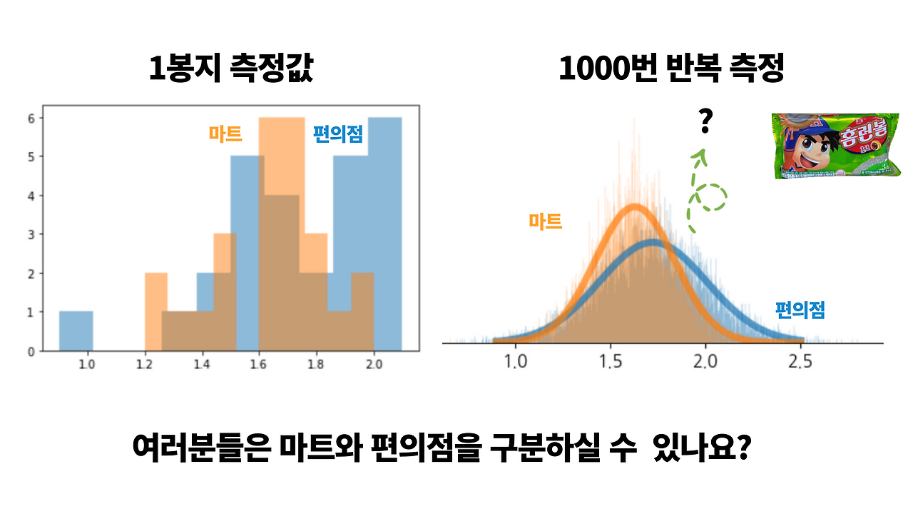 그리고 마트와 편의점 홈런볼의 측정한 데이터가 넓게 퍼져있으면 오른쪽의 넓은 흩어짐,