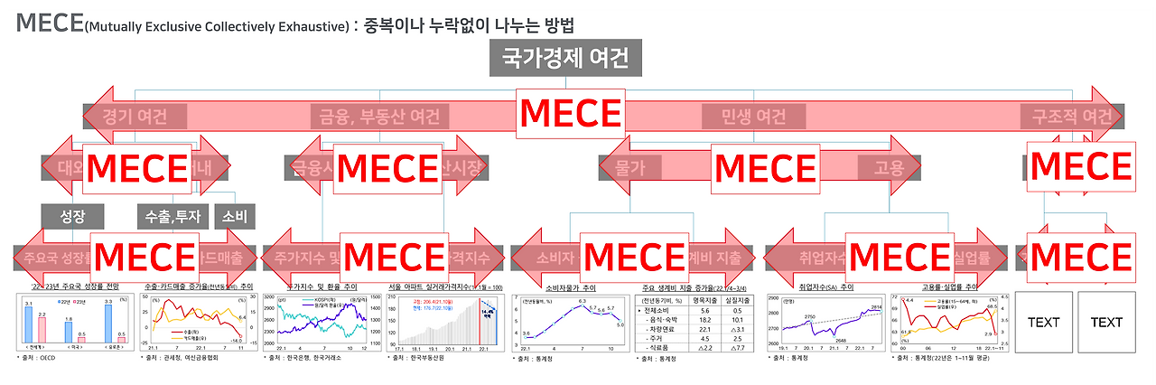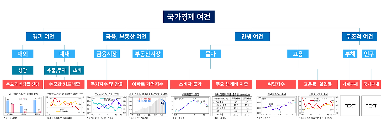 위에서 피라미드로 표현한 내용들이 서로 간에 중복이나 누락 없이 구성되었습니다. 특히 4가지 주제에 대해서는 경기 / 금융, 부동산 / 민생에 포함되지 않는 사항을 "구조적 여건"으로 표현한 것이 특징입니다.