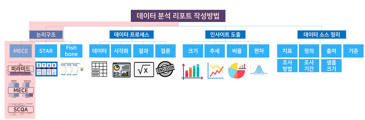 데이터 분석 리포트 쓰기 위한 많은 방법론들이 있지만 실무에 이용할 수 있는 쉬운 내용과 사례를 통해 풀어내고자 합니다. 데이터 분석 리포트를 잘 작성하기 위해서 알아야 하는 것은 아래 4가지가 있습니다.