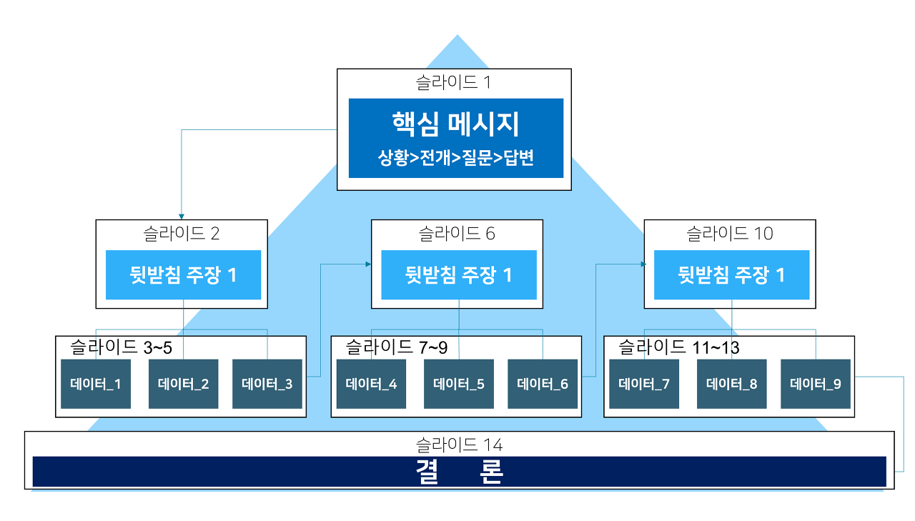 이렇게 핵심메시지 → 뒷받침 주장들 → 근거 데이터들 → 결론으로 이어지는 논리 피라미드를 그림으로 나타내보면 아래와 같습니다.