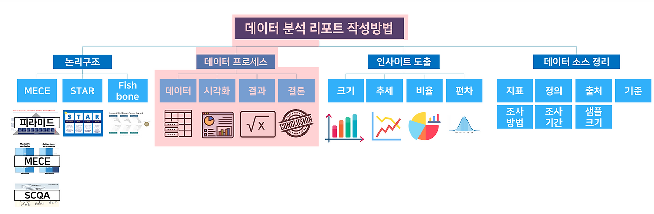 데이터 분석 리포트 작성방법은 크게 1. 논리구조 2. 데이터 분석 프로세스 3. 인사이트 도출 4. 데이터 소스 정리로 나눠서 설명할 수 있습니다. 오늘은 그중 "데이터 분석 프로세스"에 대해 함께 알아볼 차례입니다.