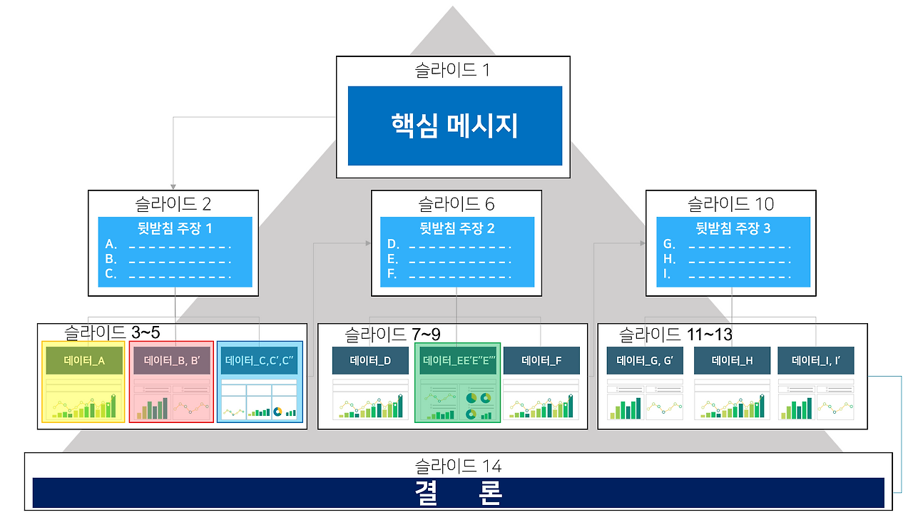 다시 복습하면 첫 번째 슬라이드에서 핵심 메시지를 전달하고, 뒷받침 주장 1, 2, 3을 기술한 슬라이드들이 서로 중복이나 누락 없이 근거를 제시합니다. 그리고 각 뒷받침 주장의 슬라이드에 대해 데이터를 표현합니다. 이때 각 데이터는 그 종류와 수에 따라 다음과 같이 구조화할 수 있습니다.