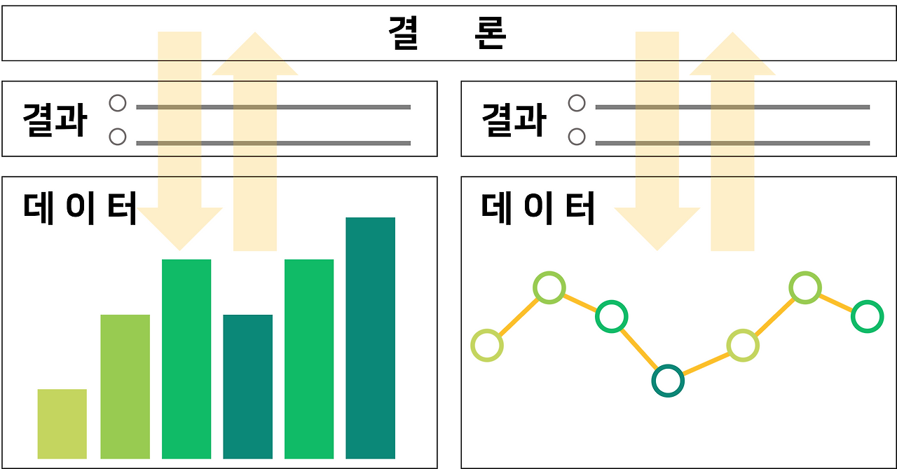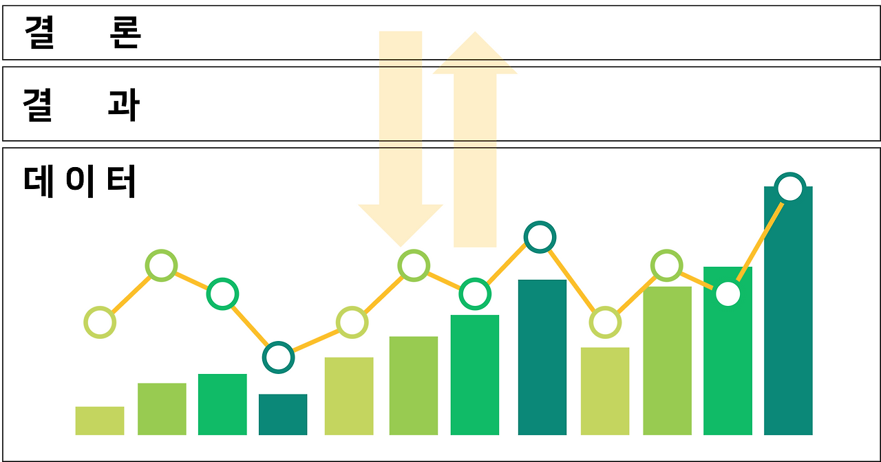 즉, 결론과 데이터는 일치해야 합니다. 사용하는 데이터가 말하고자 하는 결론과 일치할 때, 결론을 뒷받침하는 논리적 설득력을 갖출 수 있습니다. 그리고 데이터와 결론의 중간에 들어가는 과정이 바로 ‘결과’입니다.