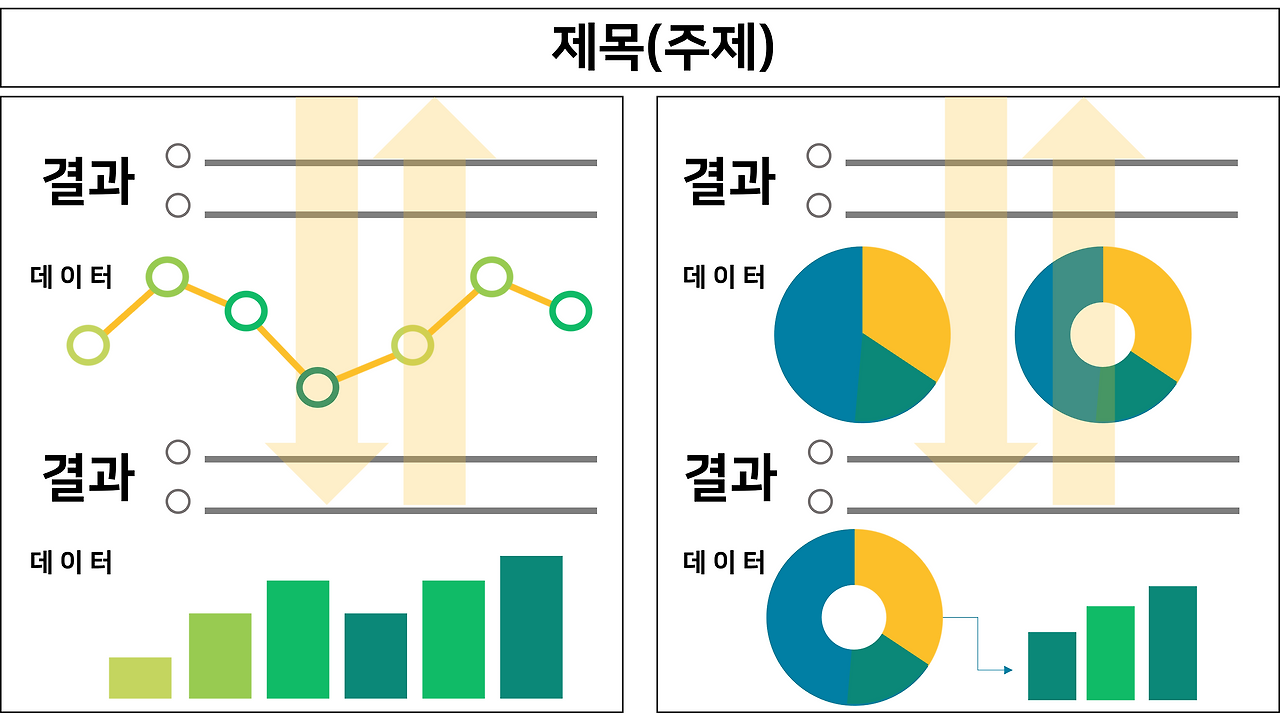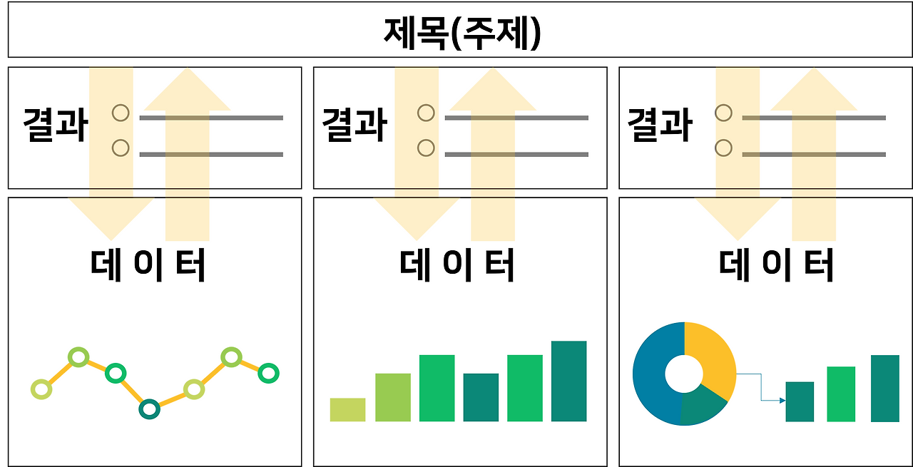 이렇게 우리는 다양한 데이터의 종류와 수에 따라서 데이터 → 시각화 → 결과 → 결론의 흐름(노란색 화살표)으로 슬라이드를 구성할 수가 있습니다. 아래 그림은 위 논리구조에서 데이터의 수에 따른 슬라이드 구성 예시입니다.