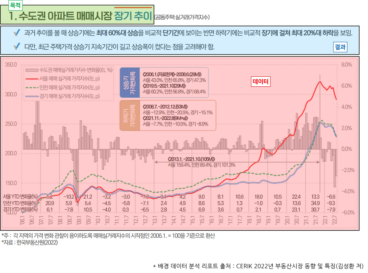 "00년부터 00년까지 상승의 흐름을 보이고, 00년 이후에는 하락 흐름을 보인다.", "상승기 변화는 00% ~00% 이고, 하락기에는 00%이다. 이는 역대 최대 하락폭의 절반 수준이다."