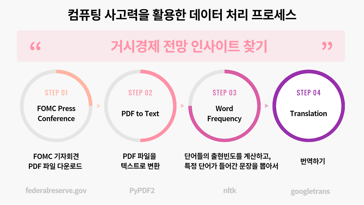 좀 더 엄밀히 말하면, 연방공개시장위원회(FOMC : Federal Open Market Committee)도 데이터를 믿습니다. 그리고 데이터에 기반한 의사결정을 하고 있습니다. 그러한 근거를 찾아보기 위해 FOMC 기자회견 발표문을 분석해보려고 합니다. 데이터를 활용하는 관점에서 컴퓨팅 사고력을 이용해서 다음과 같이 업무를 잘게 쪼개 보았습니다.