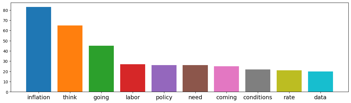 우선 기자회견 중 제롬 파월 의장의 발언에 대해 모두 분석해서 다음과 같이 단어의 빈도들을 뽑을 수 있었습니다. 코딩 수업이 아니므로 중간 과정은 생략하고 컴퓨팅 사고력 관점에서만 접근해 볼게요.