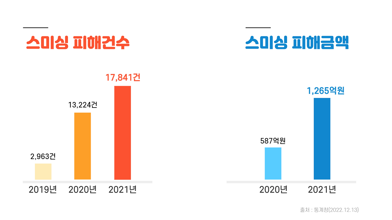 통계청에서 발표한 [범죄·안전] 보이스피싱 현황, 유형, 추이와 대응 관련 시사점('22.12.13)에 따르면 메신저피싱(스미싱)은 2019년 2,963건, 2020년 1만 3,224건, 2021년 1만 7,841건이 발생하였습니다. 그 피해금액은 2020년 587억 원, 2021년 1,265억 원으로 빠르게 증가하고 있습니다.