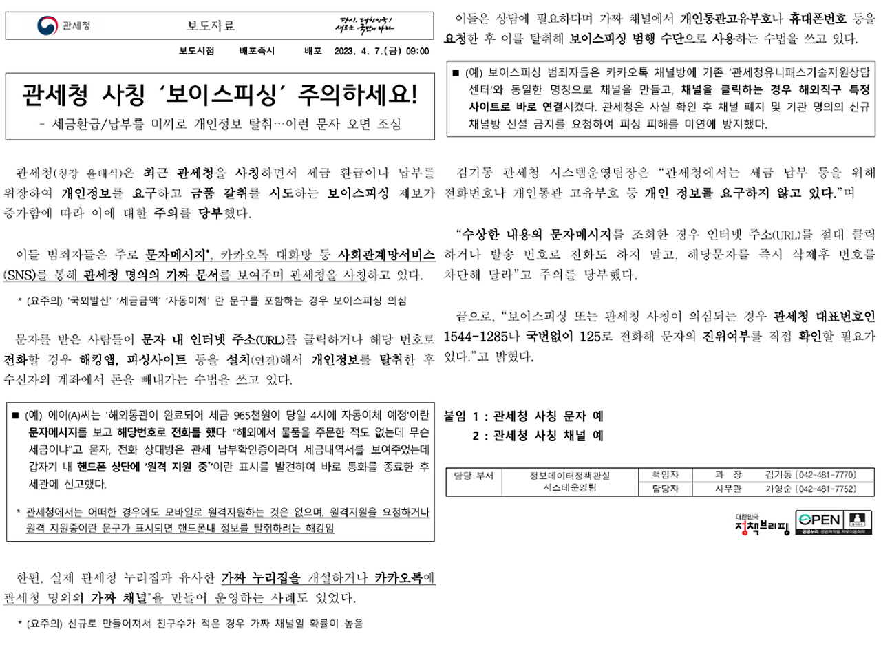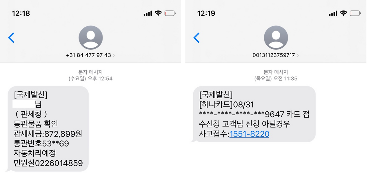 점심시간이 끝날 무렵, 통관물품을 확인하라는 문자가 왔습니다. 종종 해외 직구를 해서인지 "어? 내가 무슨 상품을 시켰었나?" 기억을 더듬어 보지만, 최근에는 구매한 상품이 없었습니다. 그리고 다음날은 하나카드 접수신청 문자가 왔습니다. "국제발신?" 해외에서 하나카드를 쓰지도 접수하지도 않았는데 말이죠.