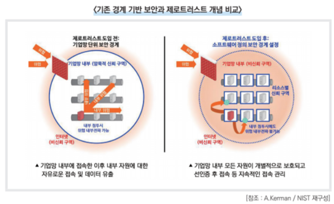 그래서 대안으로 등장한 것이 제로트러스트입니다. 미국 표준기술연구소(NIST)는 제로 트러스트의 아키텍처 7가지 원칙(7 tenets)을 발표하였습니다.('20.8) 또한 미국 대통령 바이든 정부도 사이버 보안 강화를 위해 제로트러스트 추진 행정명령을 발표하기도 하였습니다.('21.5)