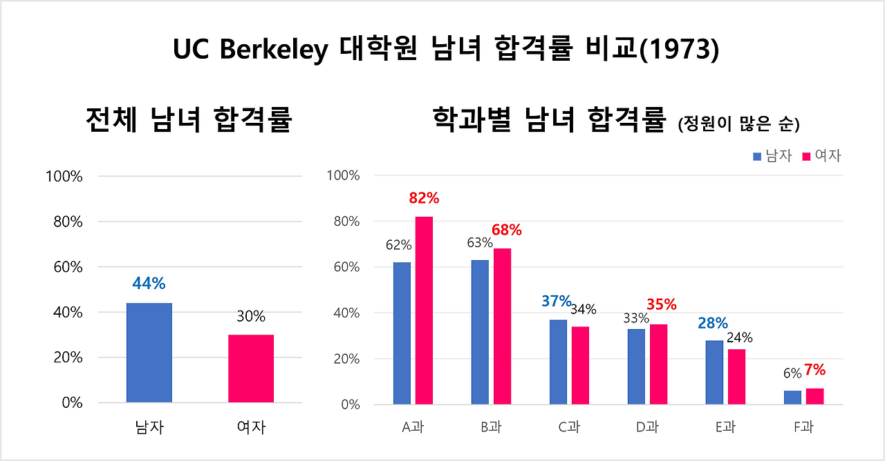 1973년 미국 캘리포니아 버클리 대학교는 대학원 입학에서 성차별 혐의로 소송을 당했습니다. 남성 지원자 8,442명 중 44%가 합격했지만, 여성 지원자 4,351명 중 35% 만이 합격했다는 것이 이유였습니다. 처음에는 전체 지원자 관점에서 비교했을 때, “남녀 합격률에 차이가 있다” 라는 유의미한 통계수치가 나왔습니다.