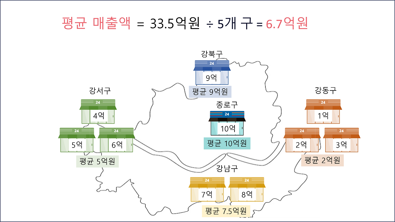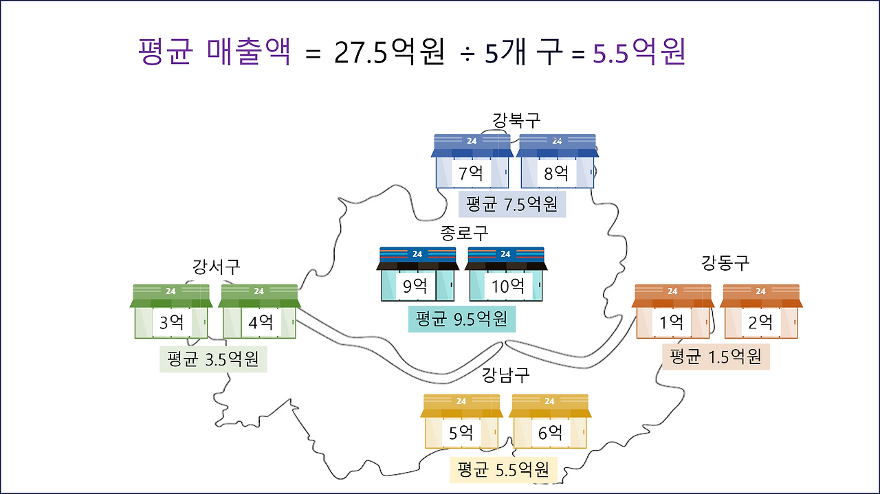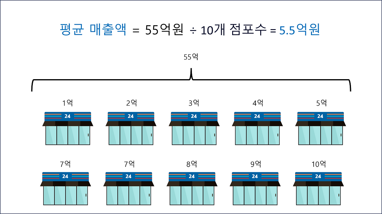 첫번째 편의점은 연매출 1억, 두번째 편의점은 연매출 2억, 세번째 편의점은 연매출 3억원입니다….10번째는 10억원이죠. 그러면 1+2+3+4+5..+10 = 55/10 = 5.5억원 입니다. 이 경우 서울 편의점의 평균 매출액은 5.5억원입니다. 실제와 많이 비슷하네요.