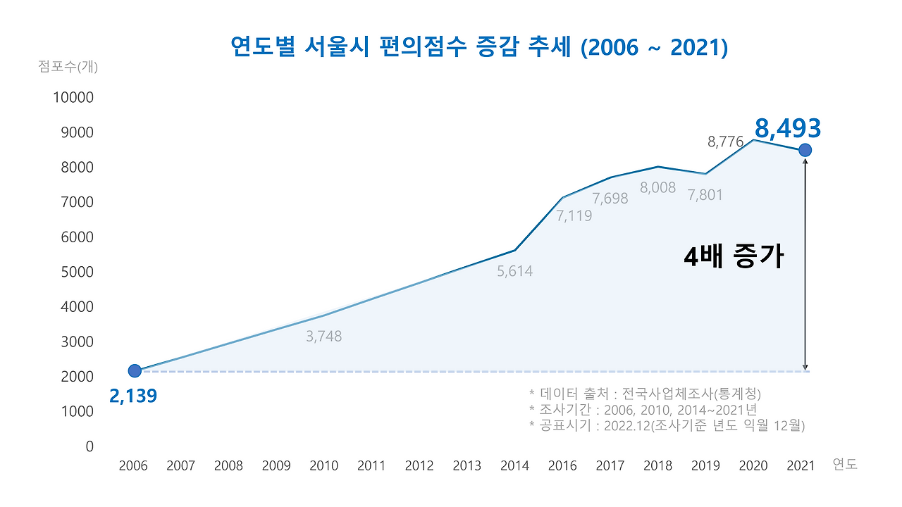 여러분, 회사 때려치고 편의점이나 해볼까? 라는 생각 해본 적 있지 않으신가요? 이런 생각을 품고 생기는 편의점 덕분에 서울에 있는 편의점수만 해도, 최근 15년 동안 4배가 증가했습니다.