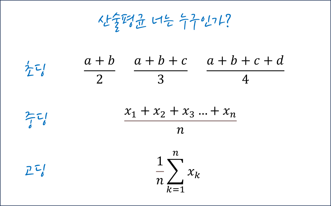 좀 더 중학생 수준으로 올라가 보면, 산술평균은 "어떤 집단의 데이터 합을 데이터의 개수로 나눠서 구한다. " 라고 표현할 수 있죠.