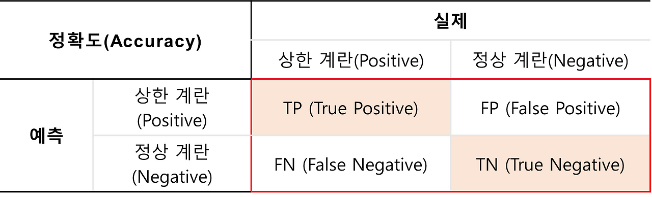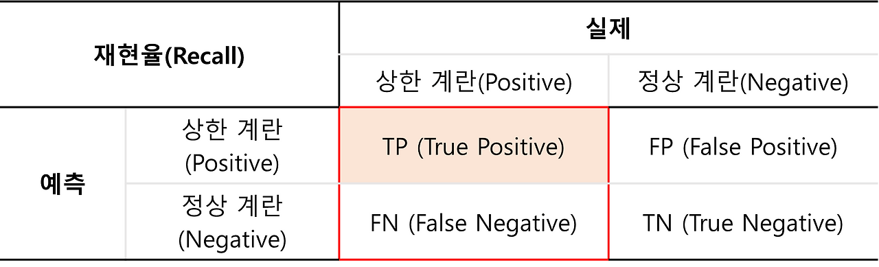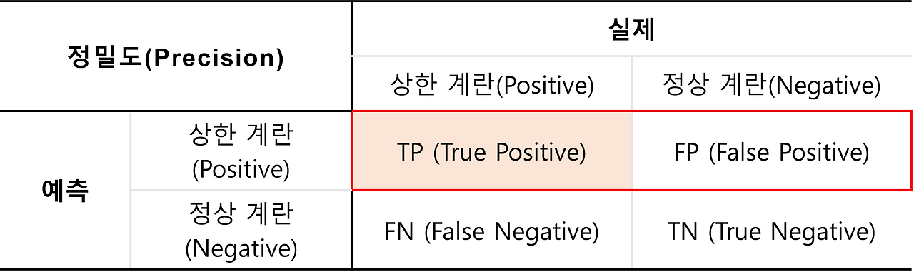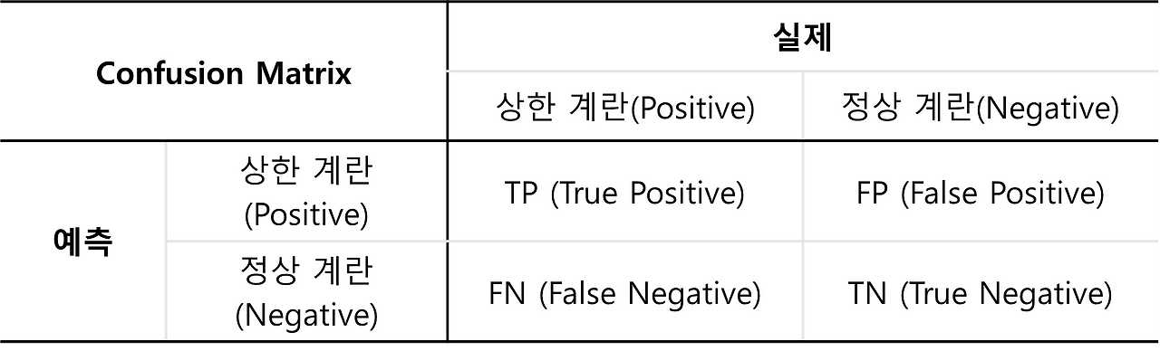 False Positive(FP) : 실제 정상 계란(Negative)을 상한 계란(Positive)라고 예측 (오답 False)