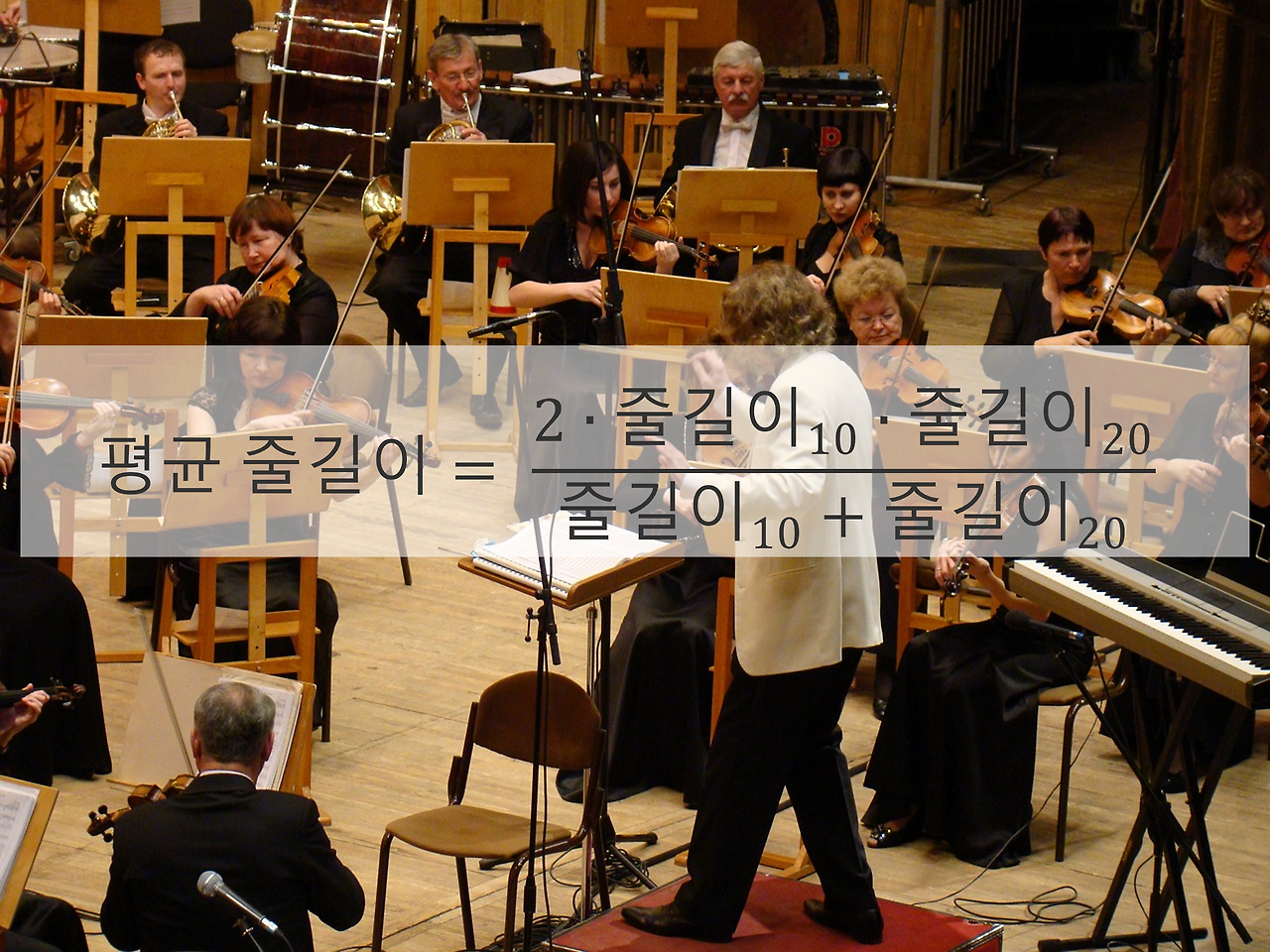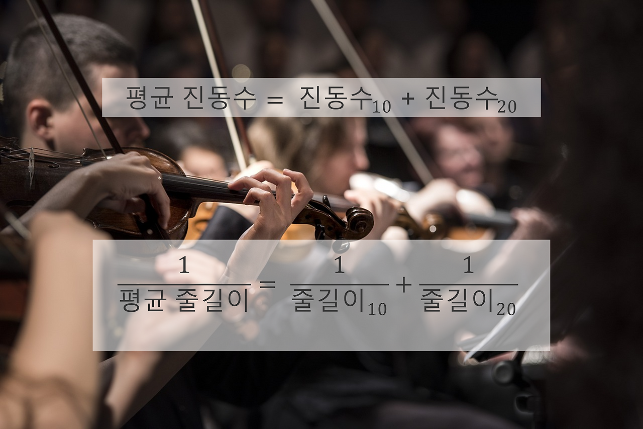 그러니까 10cm 악기 줄길이의 역수 1/10과 20cm 악기 줄 길이의 역수 1/20을 더한 후 둘로 나눠주고, 그 값의 역수를 구하면, 두 줄 길이에서 나는 소리의 평균을 만드는 줄의 길이를 얻을 수 있어요.