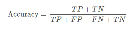 정확도란 예측으로 분류한 결과 정답을 맞힌 확률, 즉 위 표에서 TP와 TN의 비율을 더한 값입니다. 기억하시죠? T는 True, 정답이었던 것을요.