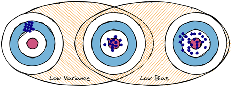 통계 관점으로 문제를 바라본 다면 다음 그림과 같이 설명될 수 있습니다. 타깃의 중심이 True 정답이라면, 왼쪽 그림은 예측된 값들 간의 분산이 작아 서로 밀집되어 있습니다. 반면에 맨 오른쪽 그림의 예측값들은 편향적이지 않게 고르게 펼쳐져 있습니다. 우리가 원하는 것은 분산도 작으면서 편향도 없는 가운데와 같은 그림의 성능을 가지는 인공지능 모델입니다.