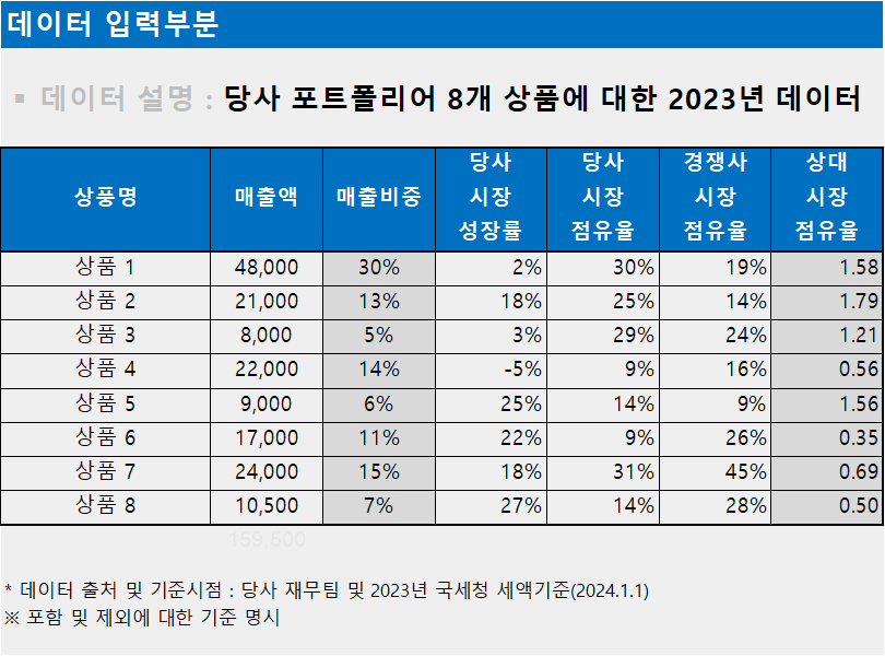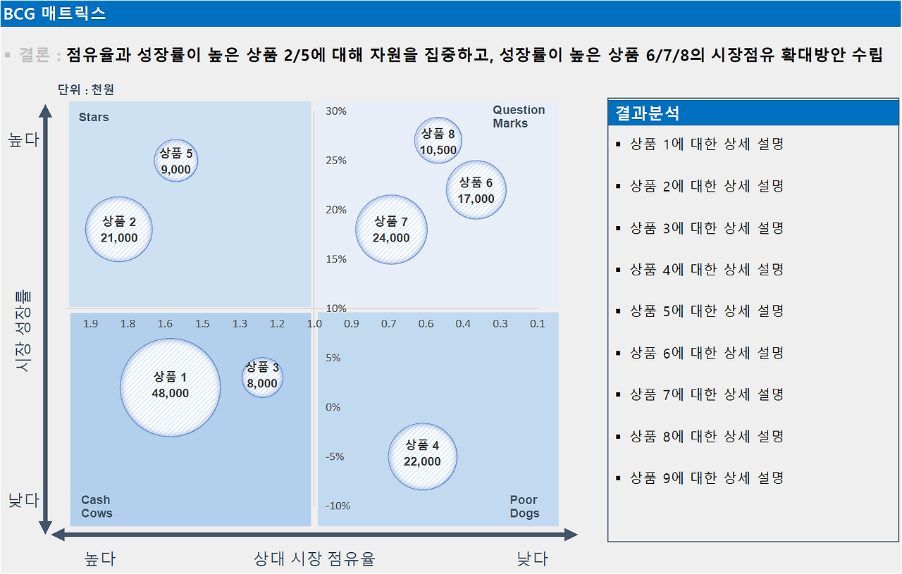 따라서 결론은 예를 들어 "점유율과 성장률이 높은 상품 2/5에 대해 자원을 집중하고, 성장률이 높은 상품 6/7/8의 시장점유 확대방안 수립"으로 정리할 수 있습니다.