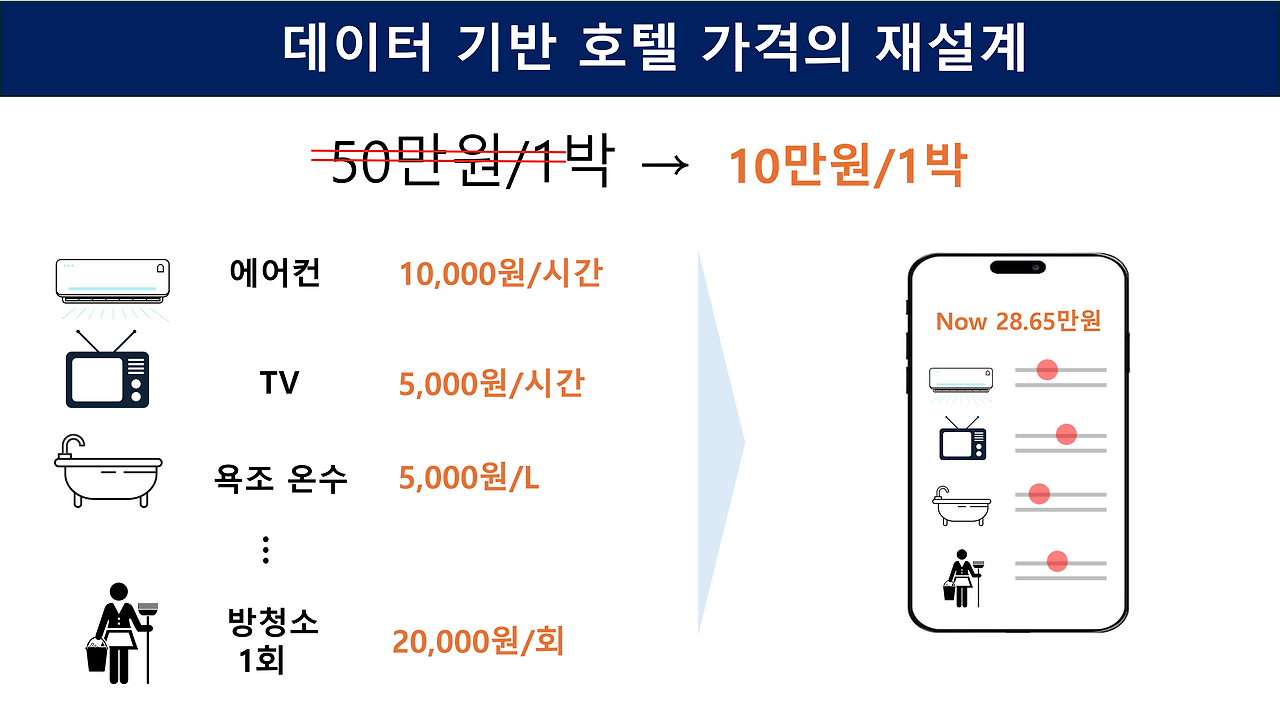 이제 앞으로는 공간에 대한 비용을 산정의 방식을 재설계할 수 있다. 기존에는 호텔객실에서 에어컨을 얼마나 틀던, 욕조에 온수를 얼마를 쓰던지, 방청소를 얼마나 하던지 객실의 금액은 동일했습니다. 하지만 이제 서비스 요금이 아래와 같이 세분화될 수 있습니다.